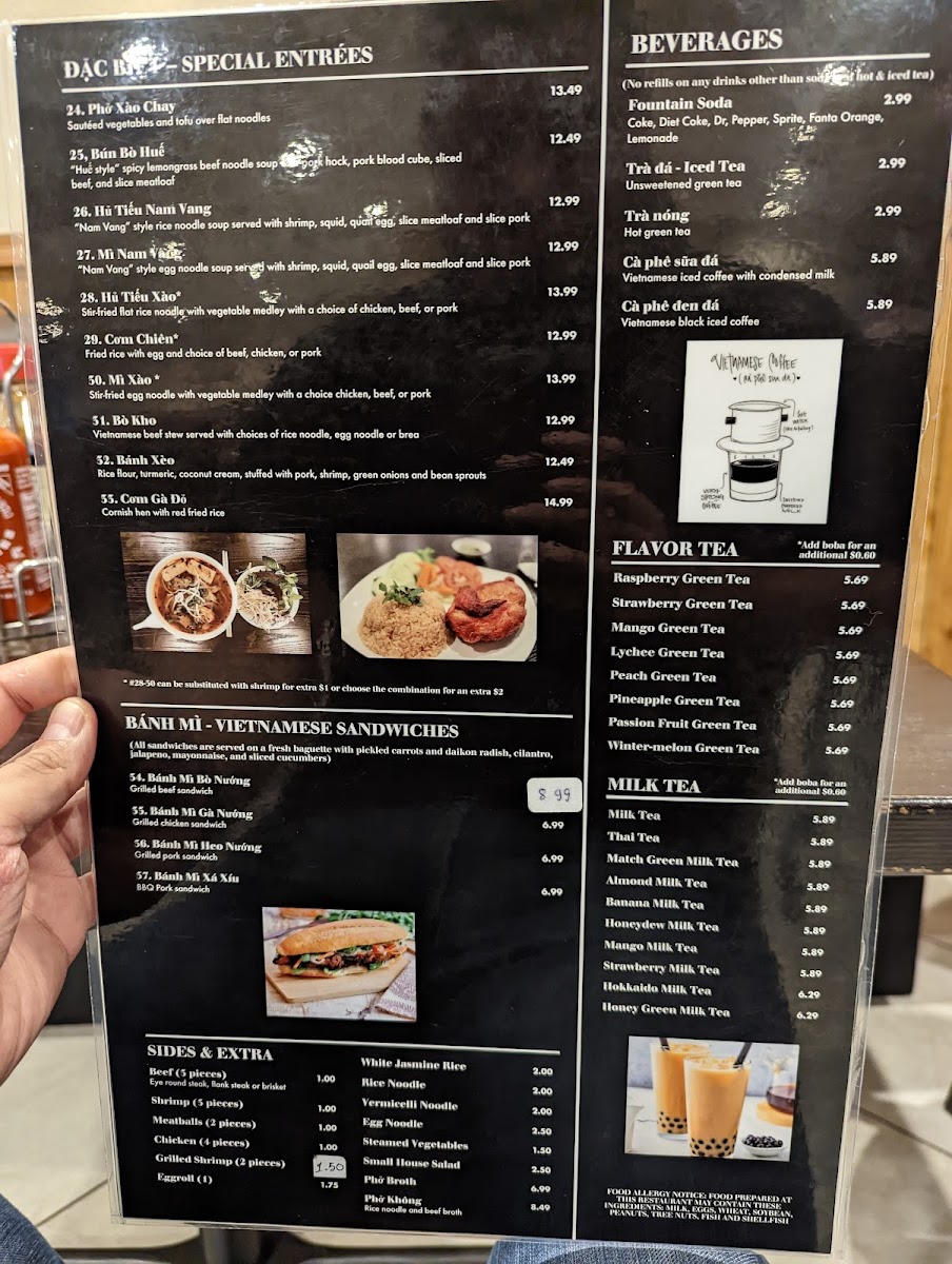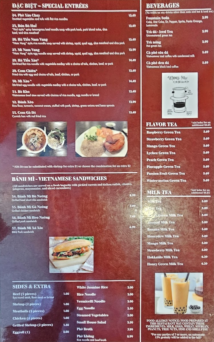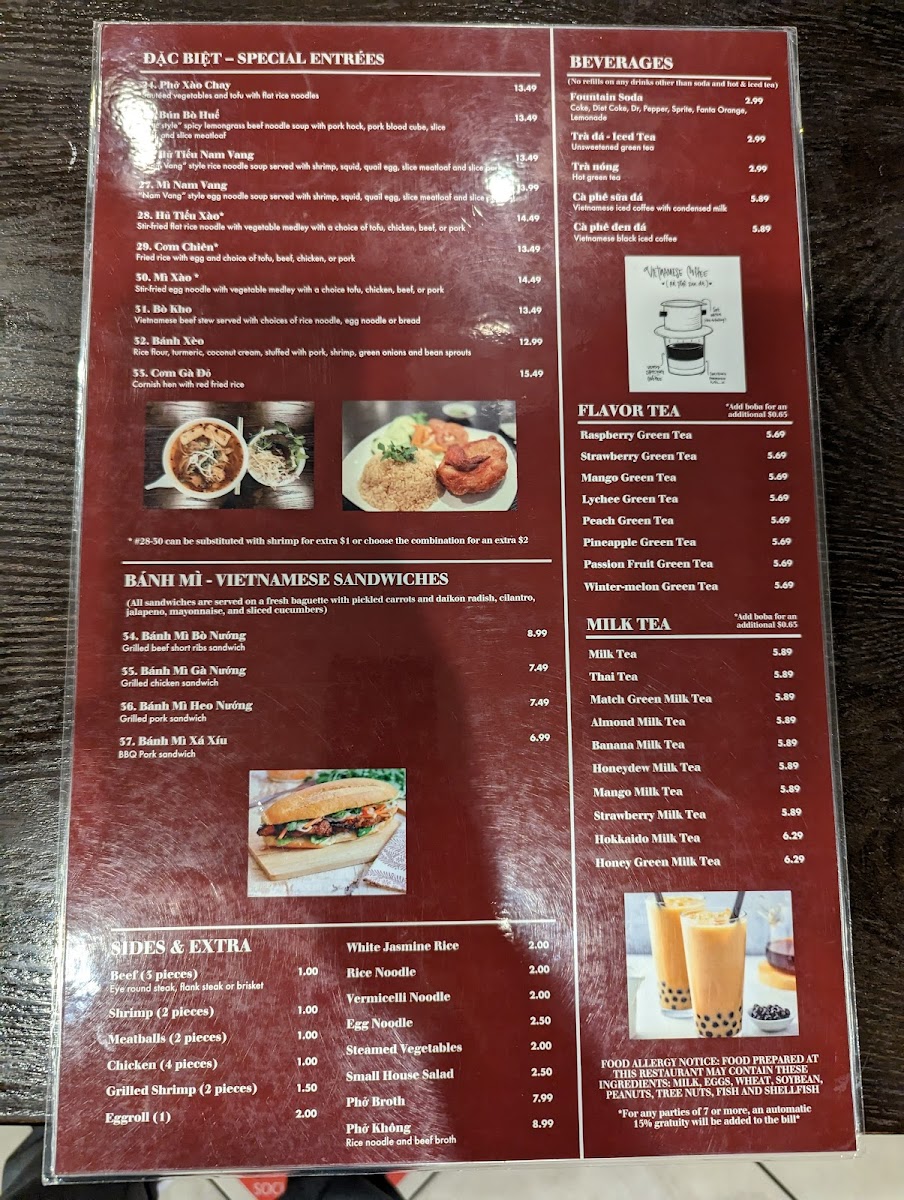 This is the kind of menu that suits many occasions, whether you’re stopping by for a warm, satisfying lunch or a relaxed dinner. The brothy phở bowls invite you to slow down and enjoy a moment of calm with familiar, soothing flavors. Paired with refreshing drinks like Thai Tea, Mango Green Tea, or a simple iced coffee, the meals align beautifully with the cozy, unpretentious atmosphere of the restaurant.